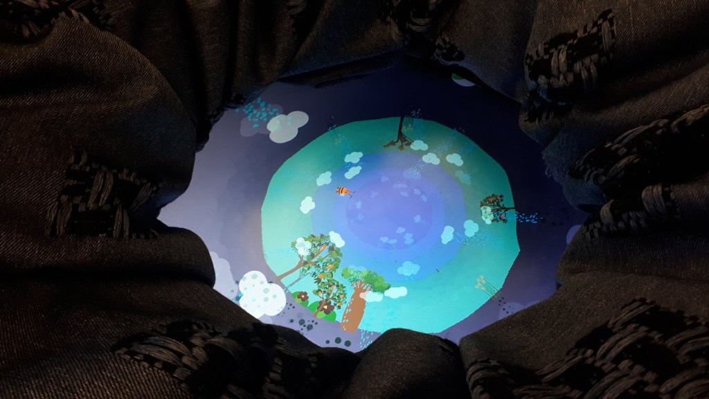 Roots is a collaboration between Rebecca Goodine and Enric Llagostera that actively involves intergenerational players in an experience that cultivates each other’s capabilities for care within a larger community. Gameplay is both haptic and visual in nature, with players working together to grow an onscreen digital garden through an alternative controller resembling an underground roots system. In the current Roots “well” design, players put their hands inside a soft padded well through holes in its sides. The game’s digital garden inside the top of the well can be grown and watered by connecting roots within the well’s interior to a circuit based ground cushion. Each root has a different feel, texture and weight, with softness and tactility acting as invitations into new and unfamiliar learning spaces. When moving below the surface of Roots, care as discovery process becomes emerges through play; where hands reaching blindly for soft control roots instead are likely to stumble into the hand of another player.